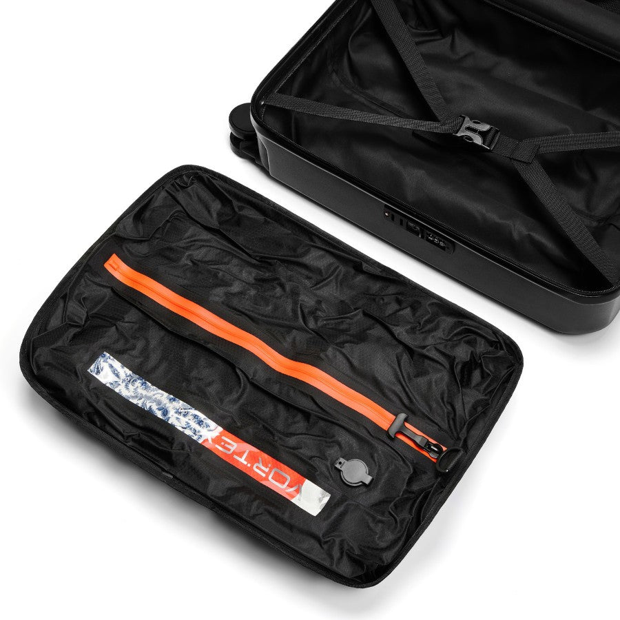 One side features a dedicated vacuum chamber for compressed clothing and soft items. -